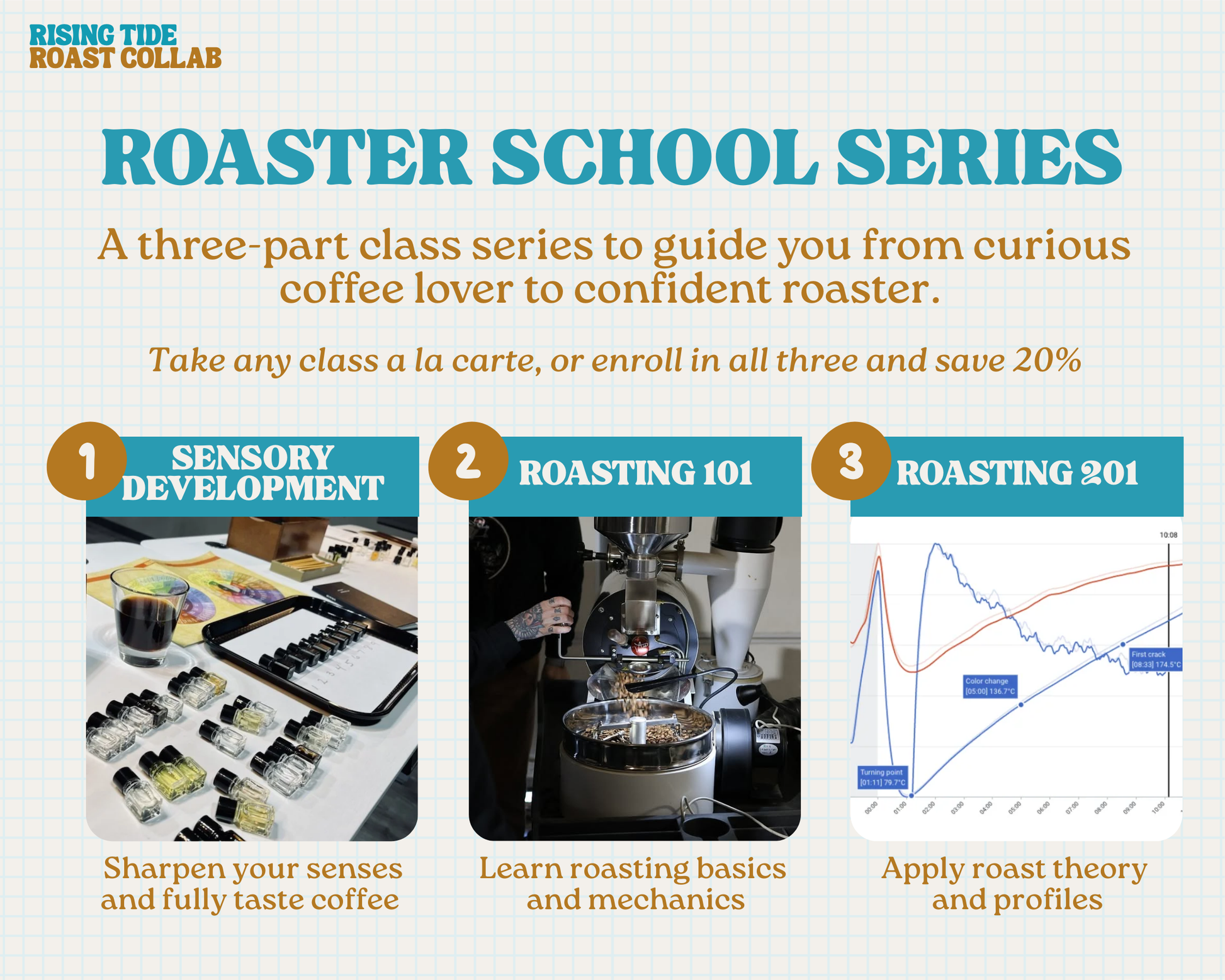 Roaster School 201 takes you deeper into the art and science of profile roasting - the art of creating and manipulating roast recipes to achieve desired flavor outcomes. You’ll learn how to: